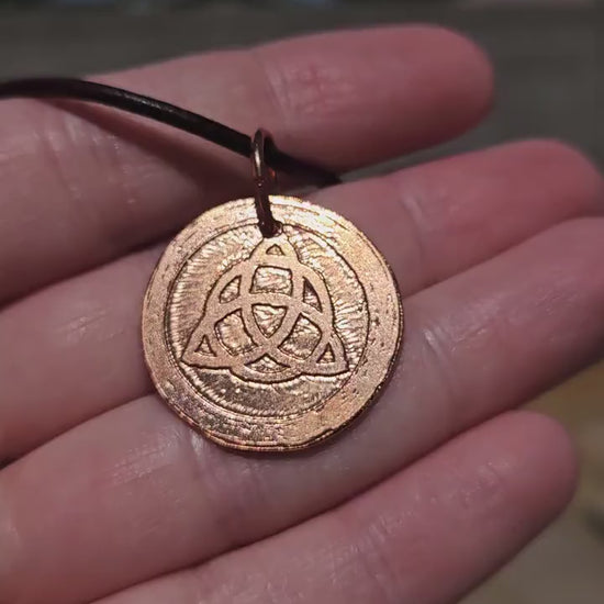 This handmade Triquetra/ Trinity Knot pendant was created by hand cutting and filing 18 gauge bare copper sheet metal. The design was etched using Ferric Chloride. (This pendant has been left shiny, and Not oxidized.)